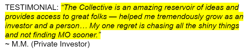 We at MO want to help you in synthesizing this noisy world. So as to allow you to block out ALL the noise, focus on the few critical inputs, risks, and trends that matter. And make more money as a result. The Collective exists to make you a calculating, ruthlessly efficient, and consistently profitable investor.